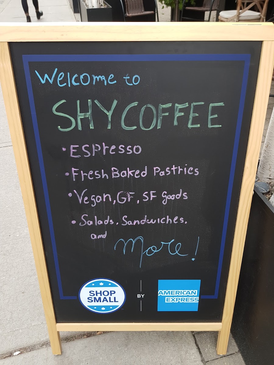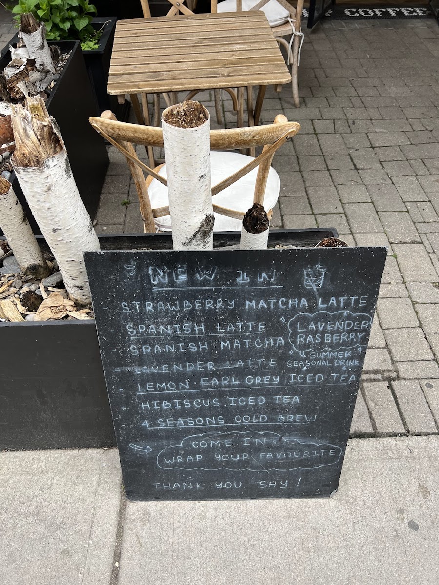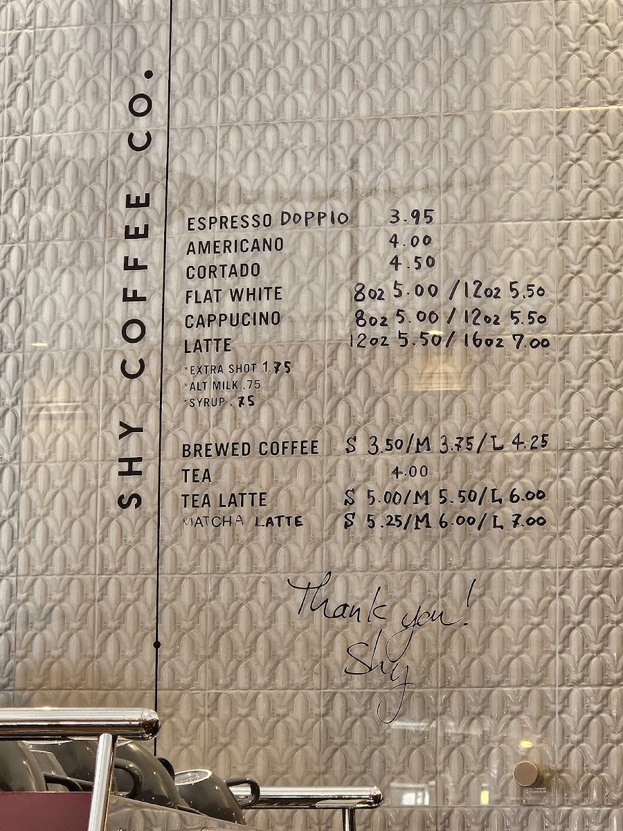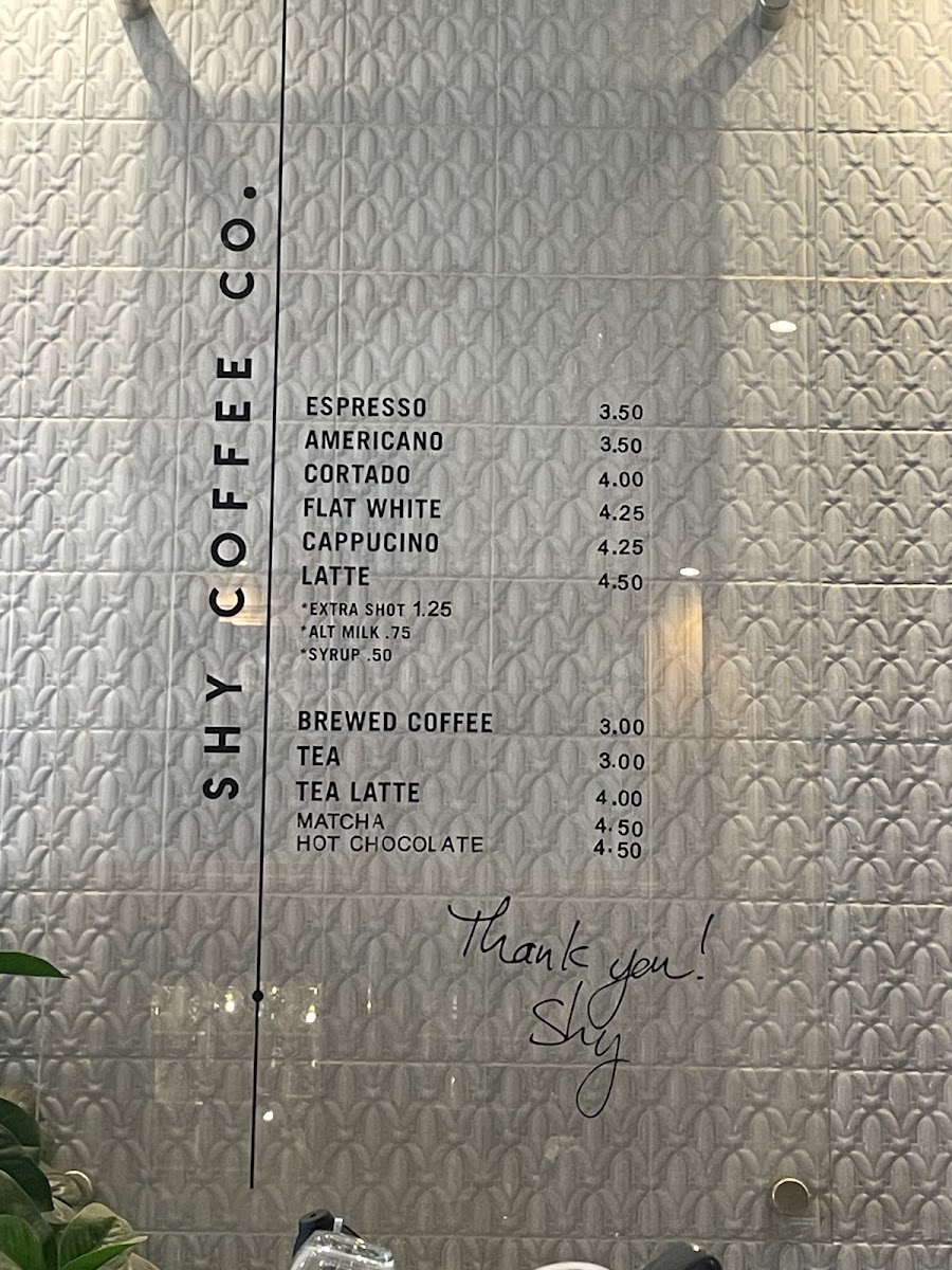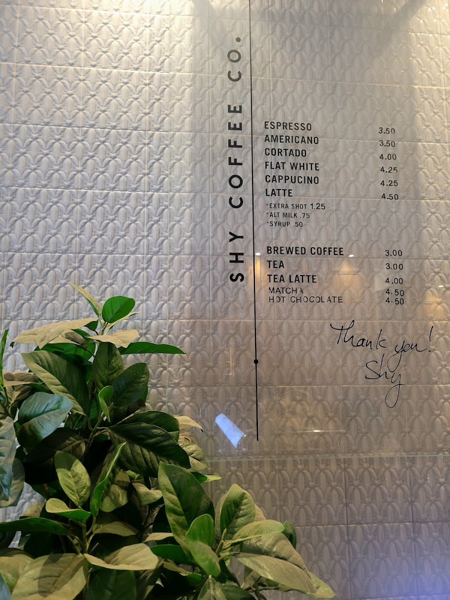 Shy Coffee Co. offers a simple yet thoughtful café menu, focusing on classic coffee drinks paired with a selection of satisfying baked goods. The menu features comforting beverages like flat whites, caramel lattes, and matcha lattes alongside easy, casual bites such as almond croissants and savory scones with sweet potato and gruyère.